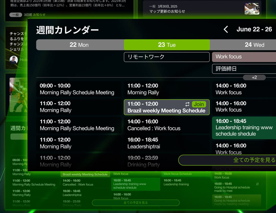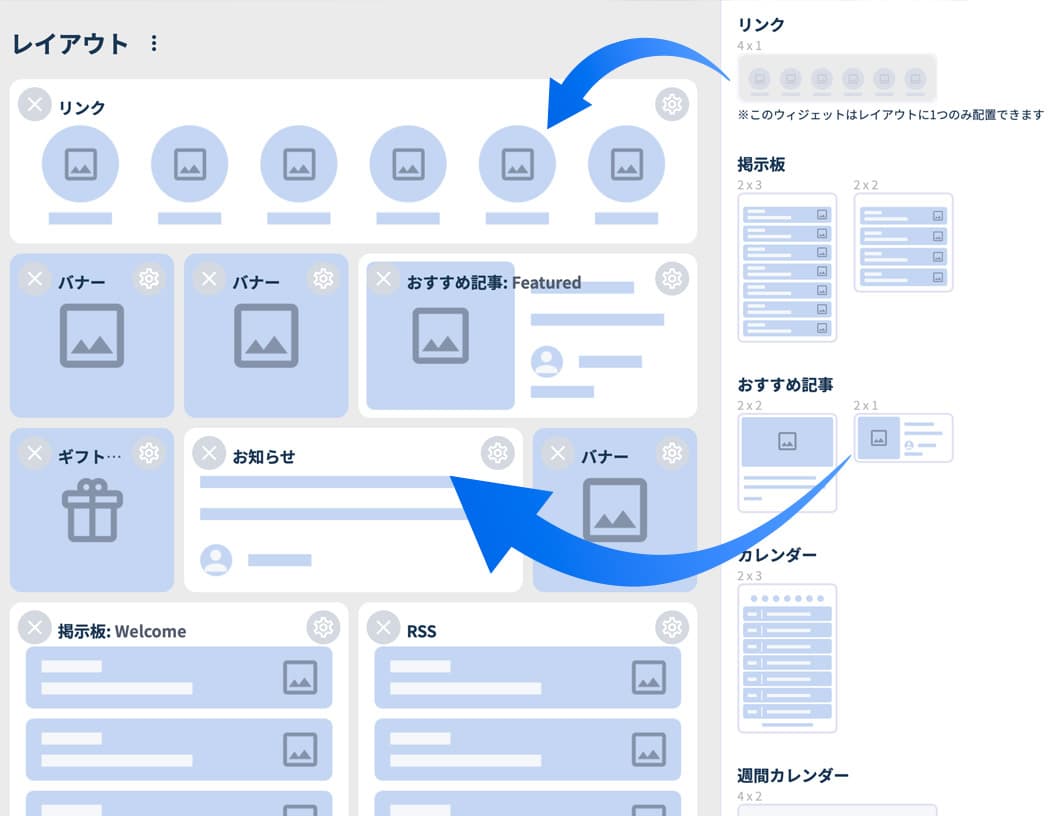 業務に必要な機能をウィジェットとして自由に配置できるため、各社の業務スタイルやカルチャーに合わせた“自社らしい”ポータルを簡単に構築できます。
